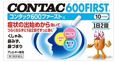 「コンタック600ファースト®」は、アレルギーの症状緩和・改善だけでなく、アレルギーの原因となる物質(アレルゲン)を元から抑え込む抗アレルギー作用を併せ持つ「ケトチフェンフマル酸塩」を「コンタック」シリーズとして初めて配合。花粉によるアレルギー症状が出始めた初期段階から服用することにより、本成分が持つ抗アレルギー、抗ヒスタミン、抗炎症の3つの働きがしっかり作用し、くしゃみ・鼻みず・鼻づまりなどの諸症状を緩和し、症状の悪化を防ぎます。